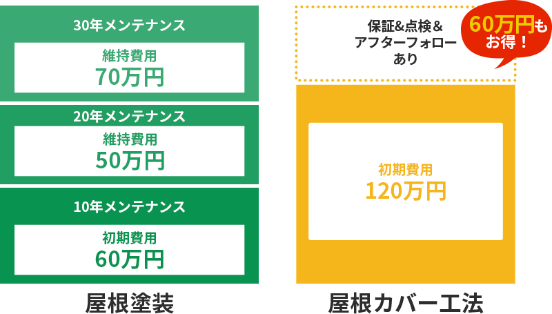 耐久年数30年のライフサイクルで比較すると、カバー工法は塗装に比べて初期費用は高くても、耐久性が高いため、その後の維持費用は安く済みます。